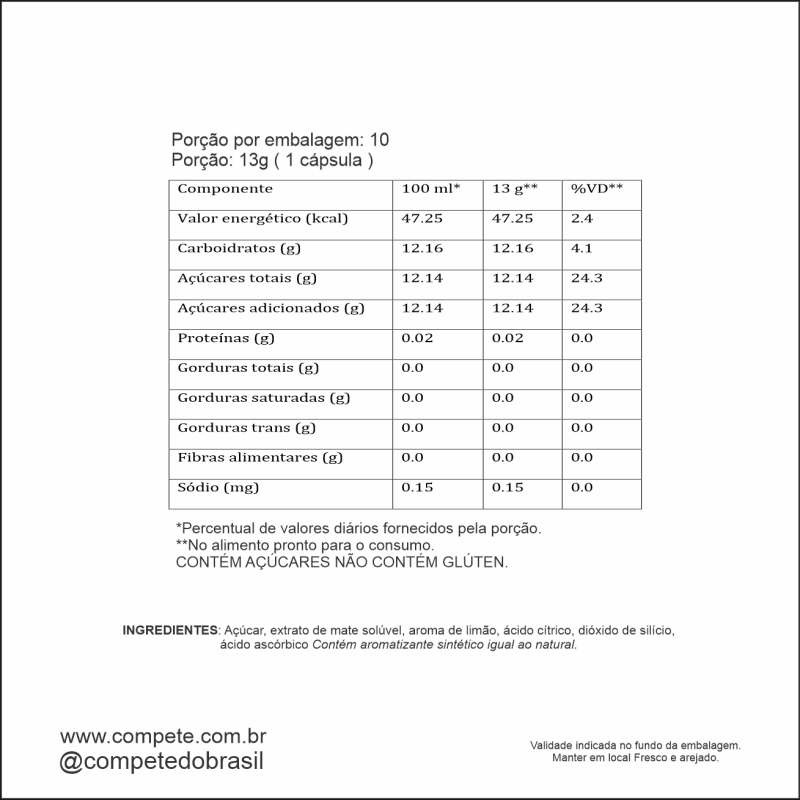 Açúcar, extrato de mate solúvel, aroma de limão, acido citrico, acido ascorbico, dioxido de silicio